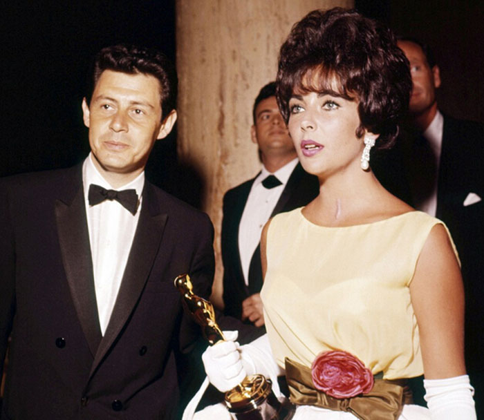在马修选择的照片中,这位传奇影星的倩影出现了好几次。另一张照片的场景是她在1961年的颁奖典礼中,挽着自己丈夫艾迪·费舍尔一同上台领奖的画面。那一年,她凭借着在电影《青楼艳妓》中的精彩演出荣获奥斯卡奖。她身穿一件迪奥品牌的礼服,包括有黄色的头饰,装饰有红花的绿腰带,以及白色的印花长裙,她的手上还戴了白色的长手套。