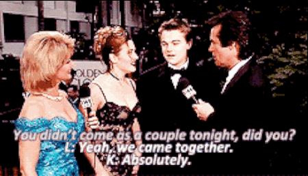 红毯主持问:你们今晚不会是以情侣的身份来的吧?!小李子来了个不承认不否认:我们是一对儿来的。温丝莱特也含糊其词:当然!