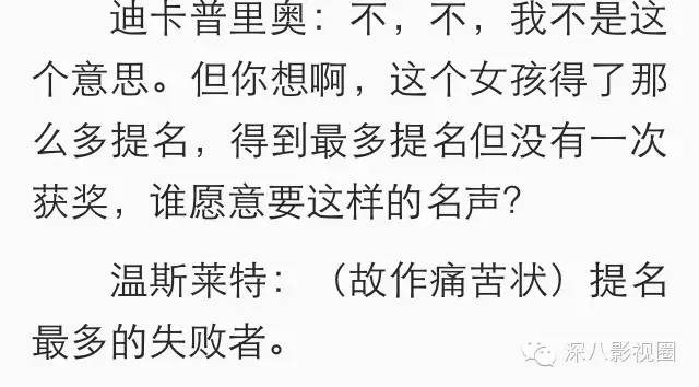 杂志采访时,小李子取笑温丝莱特多次提名奥斯卡空手而归,这次又要压力山大了。结果温丝莱特这一年就拿下了奥斯卡影后,年年陪跑变成了小李子自己的魔咒。