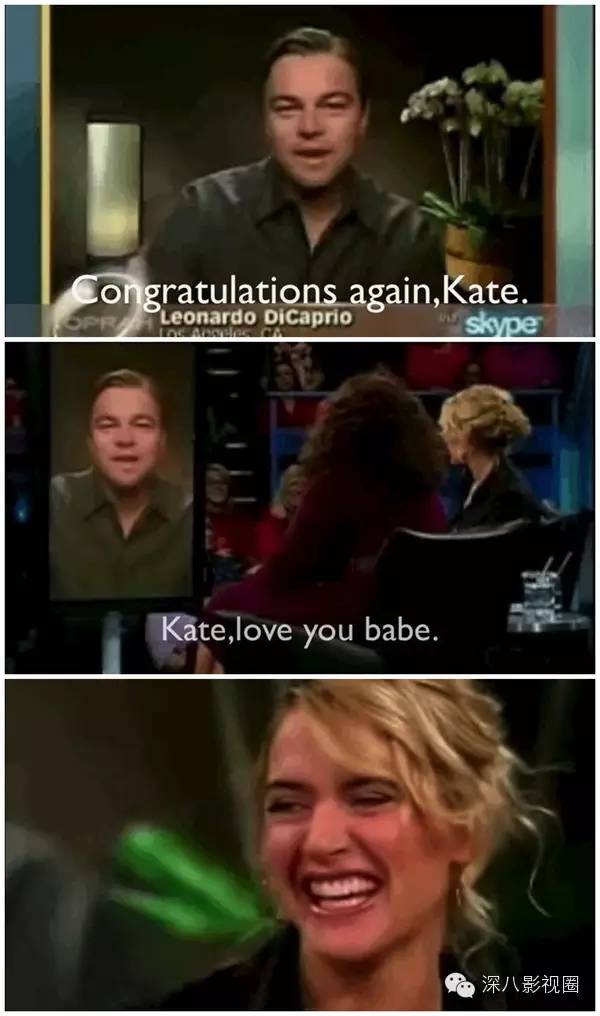 温丝莱特上电视节目时,小李子为她录了视频:再次恭喜!我爱你宝贝。
