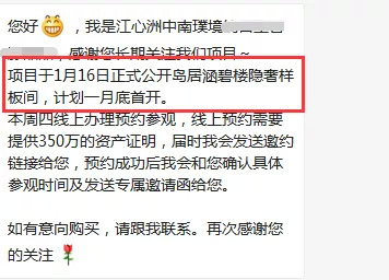 据最新消息,河西江心洲唯一纯新盘项目即将首开!本周六将公开岛居涵碧楼隐奢样板间,本周四已可以线上办理预约参观,但需提供350万的资产证明。