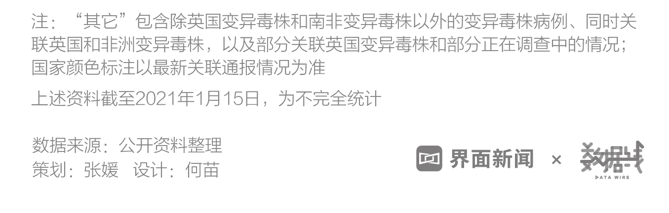 据界面数据不完全统计,截至1月15日,全球范围内,英国出现变异新冠病毒2种、南非出现1种、尼日利亚出现1种、日本出现1种(来自巴西游客)、肯尼亚出现1种、巴西出现1种、美国出现3种。