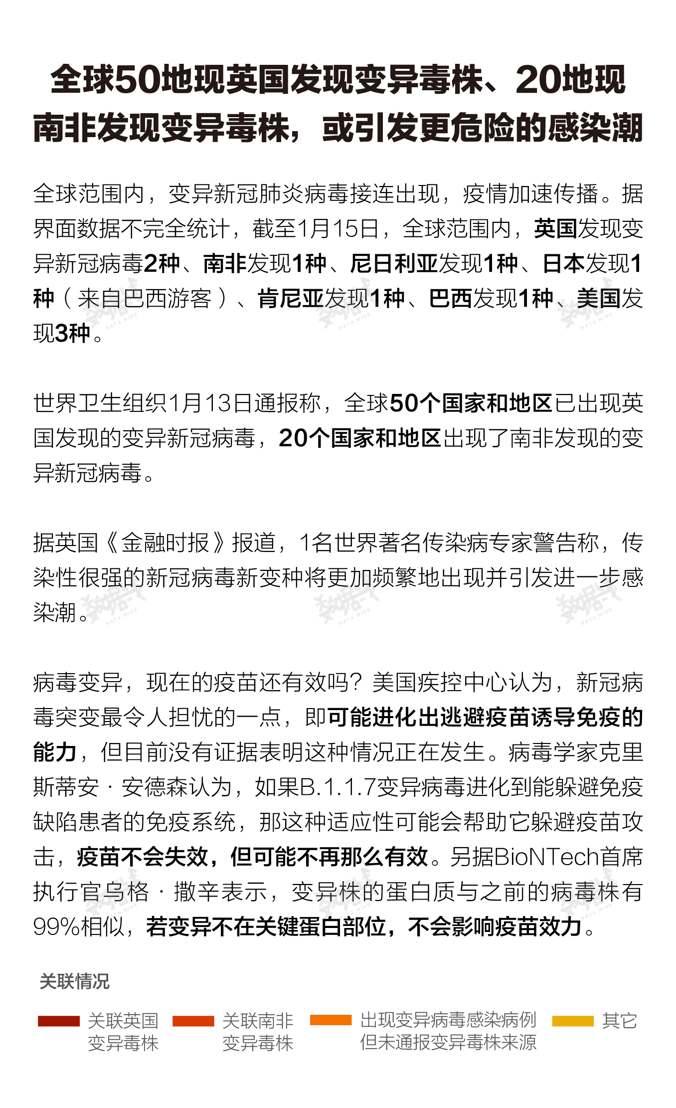 数据 | 全球50地现英国发现变异毒株、20地现南非发现变异毒株,或引发更危险的感染潮
