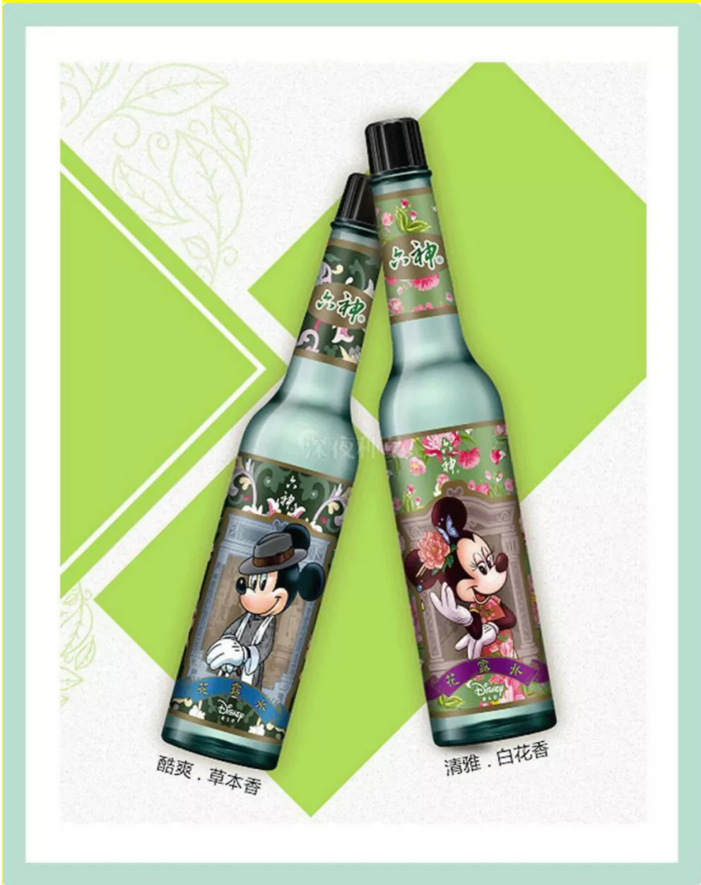 六神花露水的跨界营销主要有三个阶段。第一个阶段,与成熟的IP合作。这一阶段,六神花露水作为被授权方,与迪士尼合作,设计新玩法——将迪士尼经典的米奇米妮形象印刻在了经典六神花露水玻瓶包装上,让六神花露的经典绿玻瓶穿上了新衣裳。其中,米奇穿着中国的唐装,米妮穿着中国的旗袍,背景则是上海的石库门,极具创意地将上海海派文化和迪士尼本身的代表IP相结合,围绕两个品牌的共性做创意,最终形成的设计产生的破圈效果,得到了消费者的一致好评。