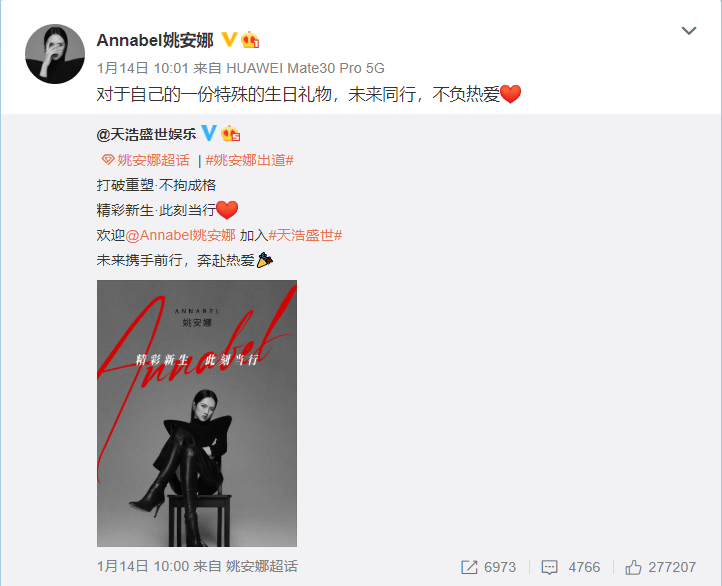 1月14日,Annabel(姚安娜)生日当天,一则娱乐公司官宣Annabel出道的消息,引发了全网热议。随后,Annabel转发了该微博并配文:对于自己的一份特殊的生日礼物,未来同行,不负热爱。同日,关于Annabel出道的17分钟纪录片随之发布。