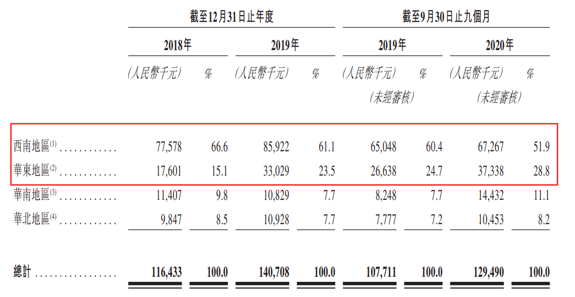 西南地区营收占据了大半壁江山,尽管2020年三季度占比有所下降,仍达到了51.9%。其次是华东地区,为28.8%。这两个地区加起来占比超过了八成。