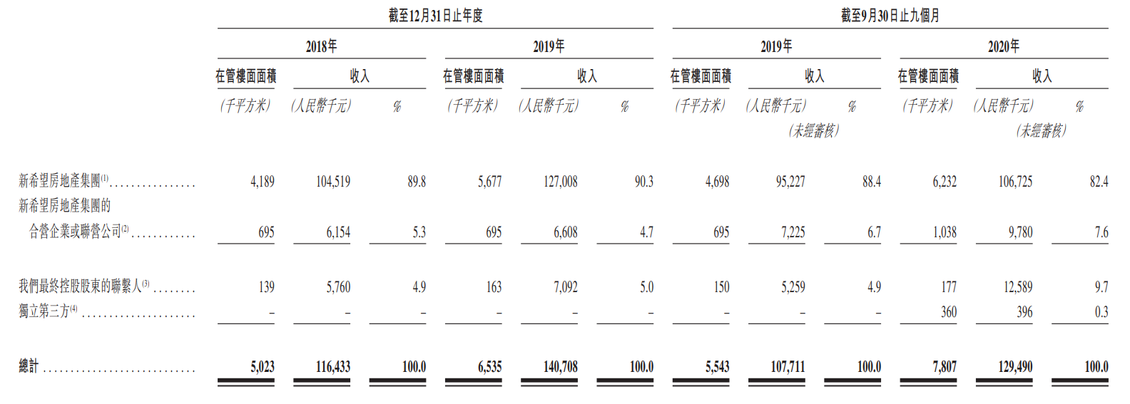 于2018年、2019年及截至2019年及2020年9月30日止九个月,其通过新希望地产产生的营收分别为1.045亿元、1.27亿元、9520万元及1.067亿元,占同期物业管理服务分部产生的总收入89.8%、90.3%、88.4%及82.4%。