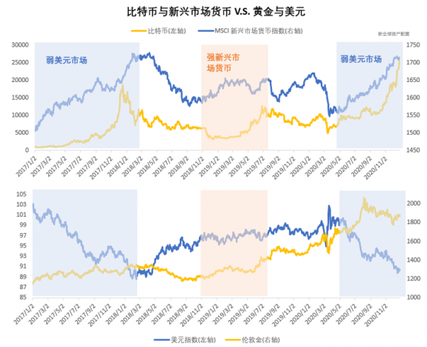 与此同时,也有分析认为,比特币并非真正的“避险资产”,更多是弱美元。由下图可见,黄金与比特币在弱美元市场走势截然相反,在风险偏好上升和弱美元时期,比特币才压过黄金一头。