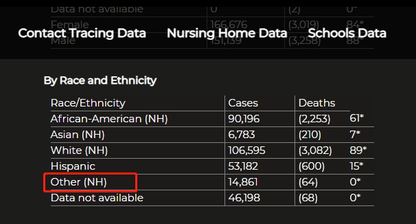 △马里兰州是美国第一个按种族类别公布新冠确诊病例的州,但其仅列出了“非裔”“亚裔”“白种人”和“拉丁裔”,其余族裔则归类为“其他”。
