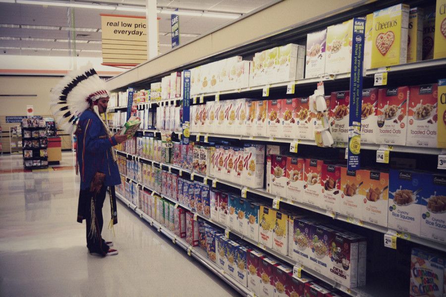 △美国原住民在当地超市货架上挑选食品,在第二次世界大战后的几十年里,大多数原住民保留地的食品主要是政府提供的工业化食物链产品:猪油、罐装食品等,这也重塑了二战后美洲原住民的饮食习惯。