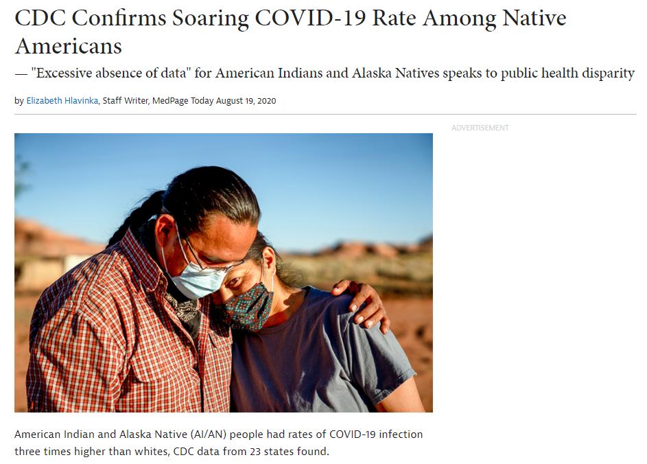△美媒:美国疾控中心确认美国原住民中新冠肺炎确诊率飙升