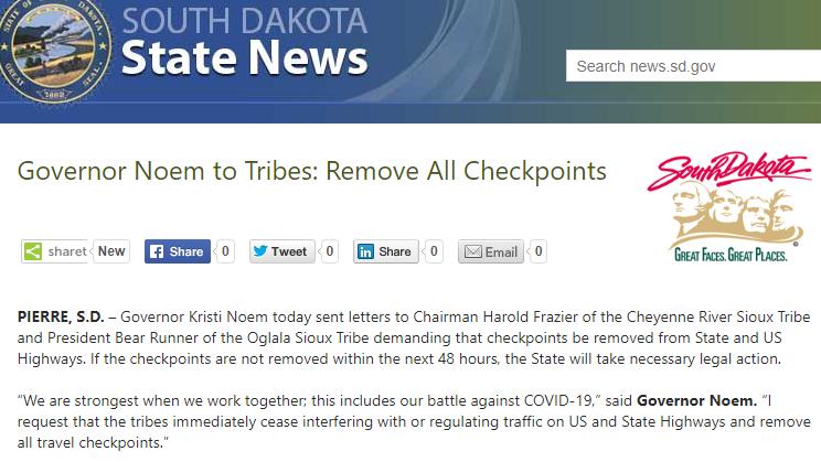 2020年4月,南达科他州苏族部落在其领地外高速路上设立检查站,严控非本地居民进入他们的生活区域。然而,南达科他州州长克里斯蒂·诺姆却称将起诉这些部落。