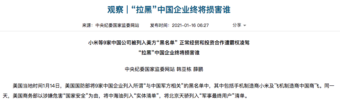 1月16日,中央纪委国家监委网站发布《观察 | “拉黑”中国企业终将损害谁》文章。文章称,美国当地时间1月14日,美国国防部将9家中国企业列入所谓“与中国军方相关”的黑名单中,其中包括手机制造商小米及飞机制造商中国商飞。同一天,美国商务部以涉嫌危害“国家安全”为由,将中海油列入“实体清单”,将北京天骄列入“军事最终用户”清单。