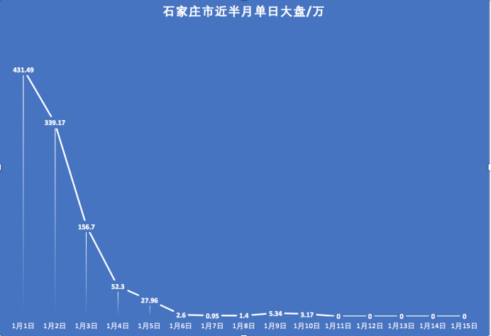 同样的,已经封城的邢台市、廊坊市的大盘也经历和石家庄市类似的过程,从1月1日开始便直线下滑直至变为0。