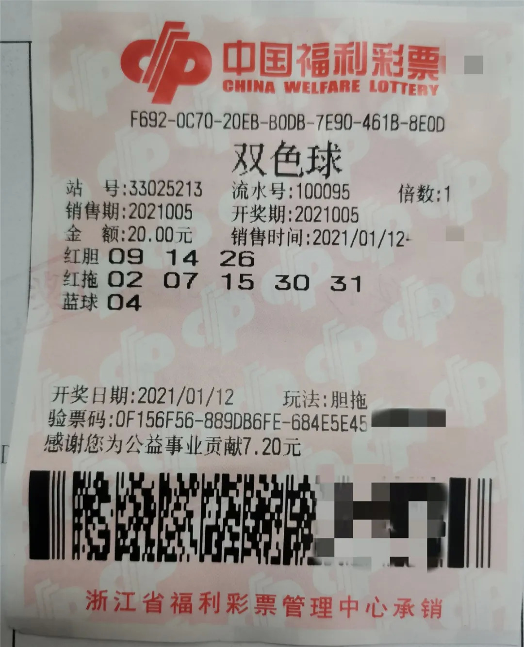 2021年1月12日晚,福彩“双色球”第2021005期开奖,一位幸运彩友仅花20元,便将当期的1注一等奖和若干固定奖收入囊中,共获税前奖金6372546元,这也是本年度宁波地区中出的首注福彩“双色球”一等奖。次日上午,这位幸运儿陈女士(化姓)在丈夫的陪同下现身宁波市福彩中心,办理了相关兑奖手续。