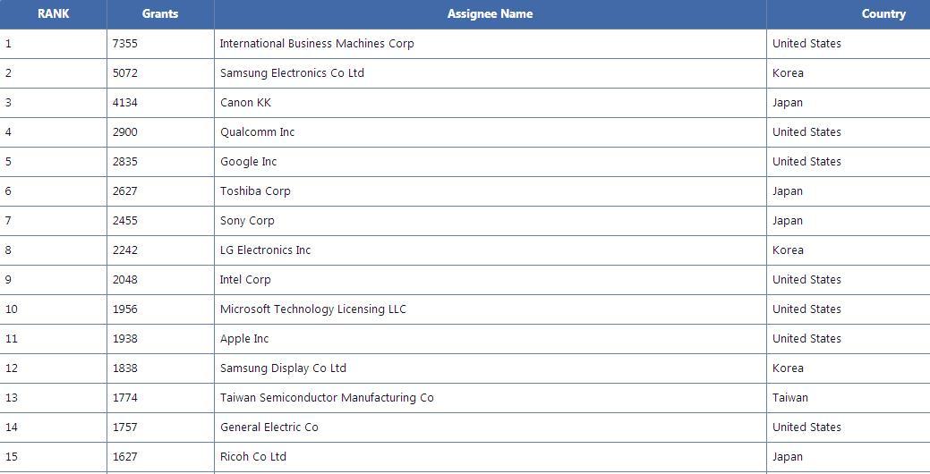 专利数量固然是专利实力的重要指标,但专利实力并不等于专利数量,而产品在市场中的竞争力又不等同专利实力。苹果是全球市值最高的上市公司,但是苹果执IT之牛耳并非全部因为专利。IFI发布的2015美国专利统计表中排名前三的是IBM、三星电子和佳能(见图1)。