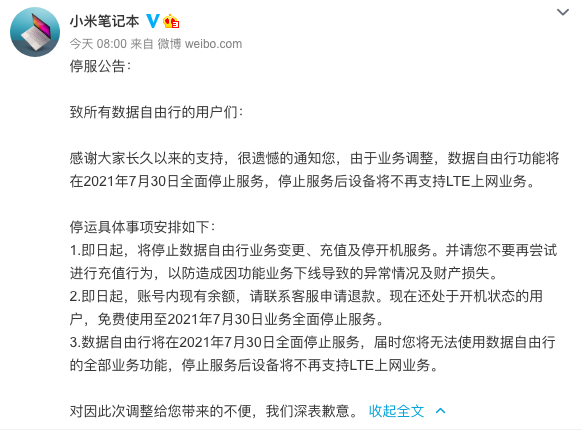 1月16日,@小米笔记本 发布公告表示,由于业务调整,数据自由行功能将在2021年7月30日全面停止服务,停止服务后设备将不再支持LTE上网业务。