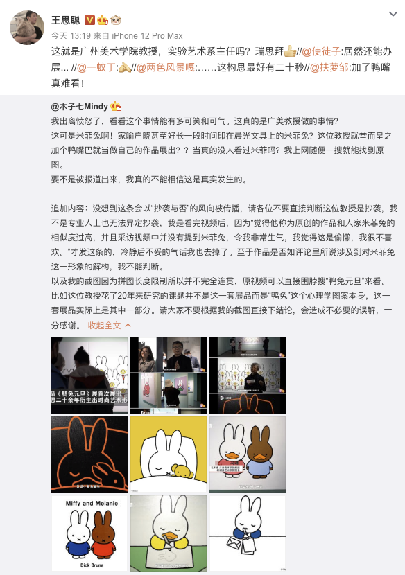 近日,因为一场《鸭兔元旦》的展览,广州美术学院教授、跨媒体艺术学院院长冯峰陷入“抄袭”争议,不少网友认为其作品与米菲兔相似度过高。