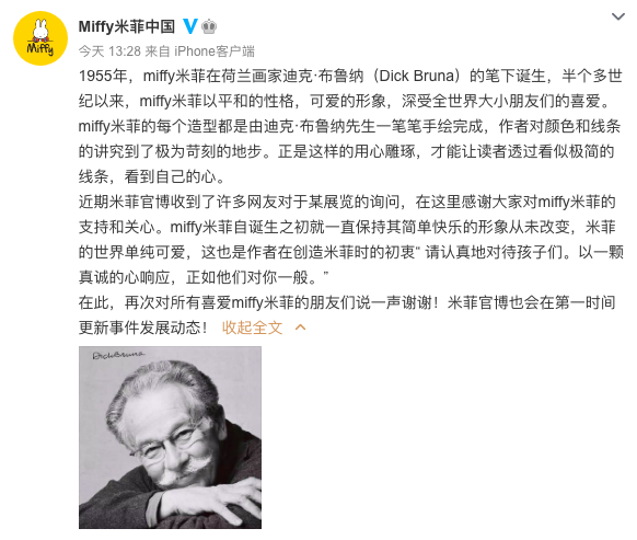 稍后,米菲官博发文表示,近期收到了许多网友对于某展览的询问,感谢大家对miffy米菲的支持和关心。miffy米菲自诞生之初就一直保持其简单快乐的形象从未改变,米菲的世界单纯可爱,这也是作者在创造米菲时的初衷“ 请认真地对待孩子们。以一颗真诚的心响应,正如他们对你一般。”米菲官博将在第一时间更新事件发展动态!