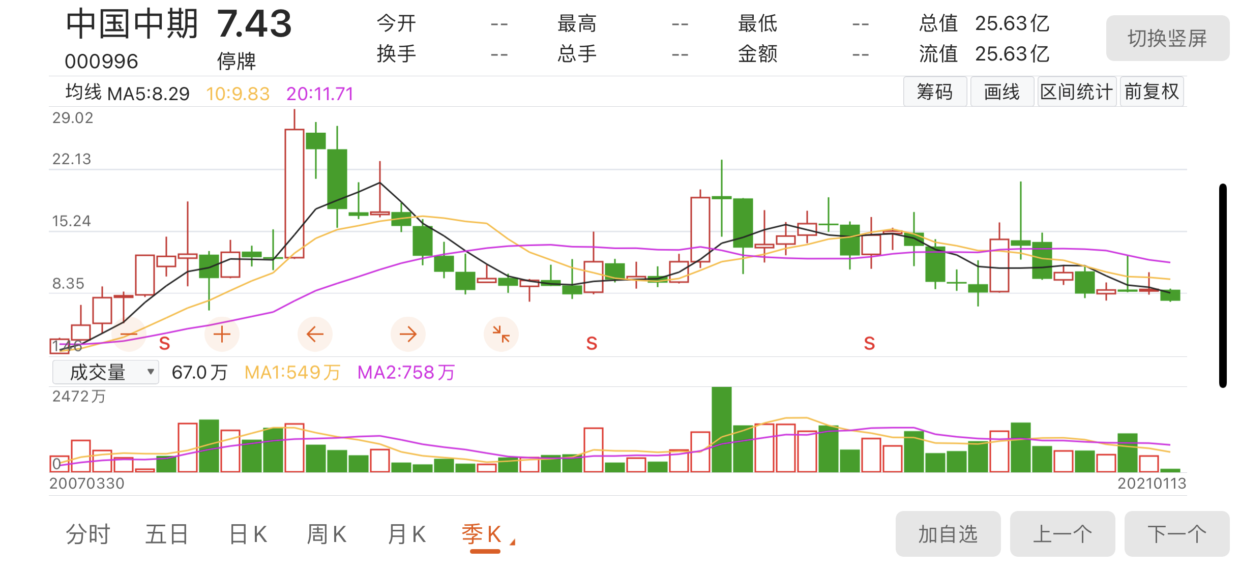 这让中国中期在资本市场的表现不太理想。界面新闻记者了解到,该公司股价最高出现是2010年3月31日的28.96元/股,此后11年股价波动下滑,截至2021年1月13日其停牌前的收盘价是7.43元/股,市值只有25.63亿元。而瑞达期货截至2021年1月14日最新市值达102亿元,南华期货最新市值逼近94亿元。