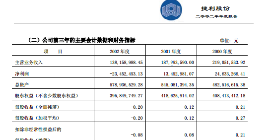 但上市第二年,捷利股份业绩就开始走低,并在2002年亏损。财务数据显示,2002年,公司净利润从2000年、2001年的2463.33万元、1345.29万元一路下滑至-2345.24万元。此后,公司经营情况始终不太理想。