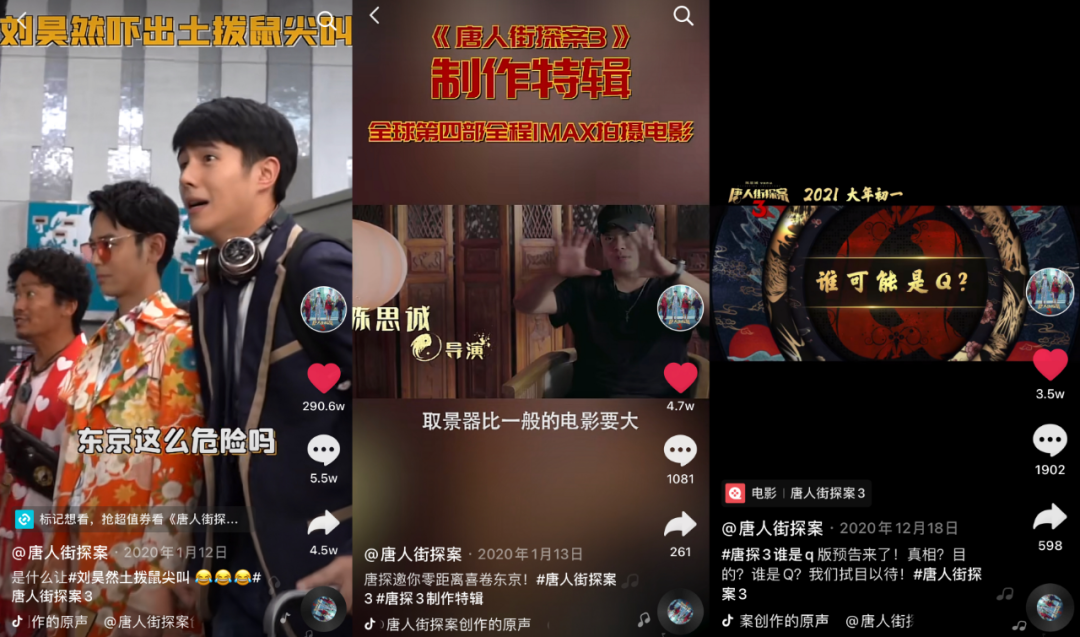 而截至目前,该片在抖音上点赞最多的是一条花絮视频。视频中,唐仁、秦风、野田昊(妻夫木聪饰)三人在东京亮相,透露出这一部故事将在日本展开的信息,最终该视频获得高达290.6w点赞,4.5w评论量。