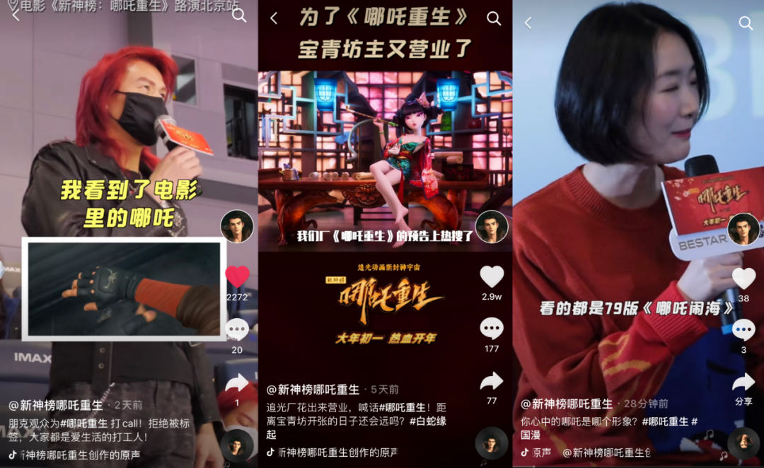 《哪吒重生》是2021春节营销真正意义上的“抢跑者”。近期,该片已在北京开启路演场,一些观众映后发言视频被片方搬上抖音,在口碑营销上占了先机。