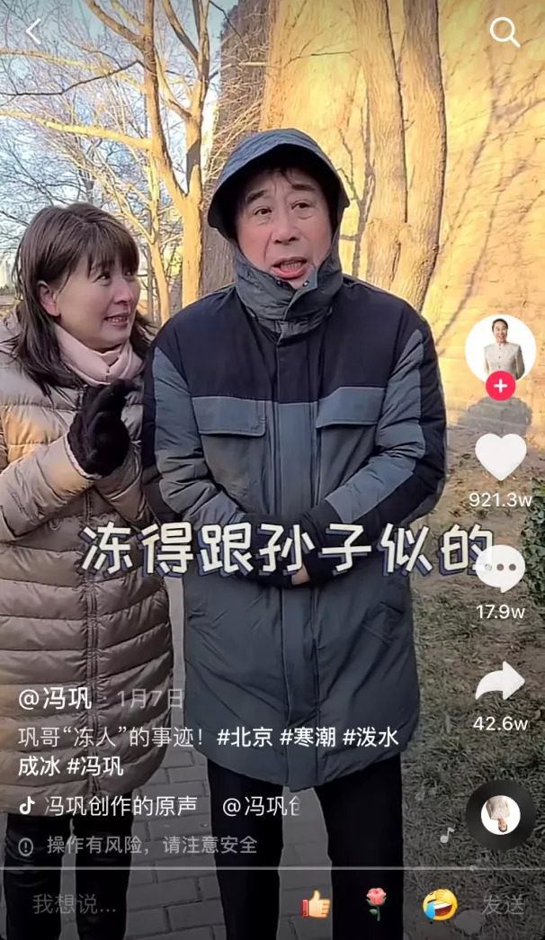 著名小品演员郭冬临如今成为了抖音与快手上妥妥的顶流。他的《暖男先生》系列短剧,在抖音收获了2612万粉丝、103.8亿播放量,在快手收获了1651万粉丝、35.1亿播放量。同样是在短视频平台上,上周冯巩的一条“冻得跟孙子似的”短视频,累计点赞量突破900万,成为当周抖音最热门的一条短视频,网友直呼“这是降维打击”。