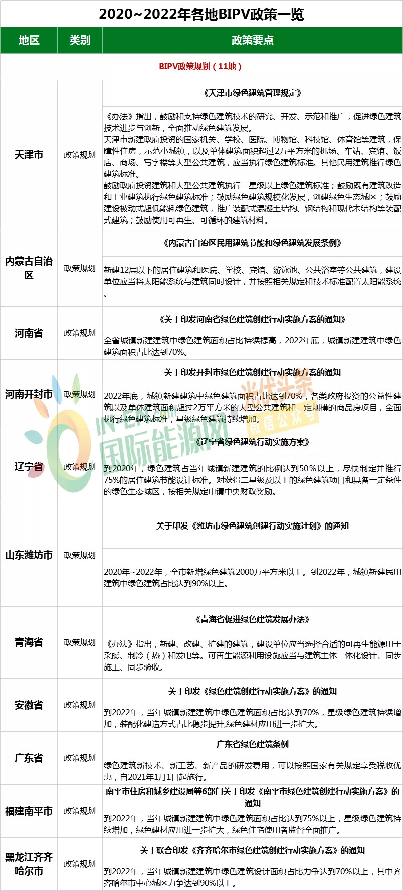 天津、内蒙古、河南、河南开封市、辽宁、山东潍坊市、青海、安徽、广东、福建南平市、黑龙江齐齐哈尔市、云南、山西、山东、宁夏、陕西16地发布BIPV 三年规划(2020~2022年);