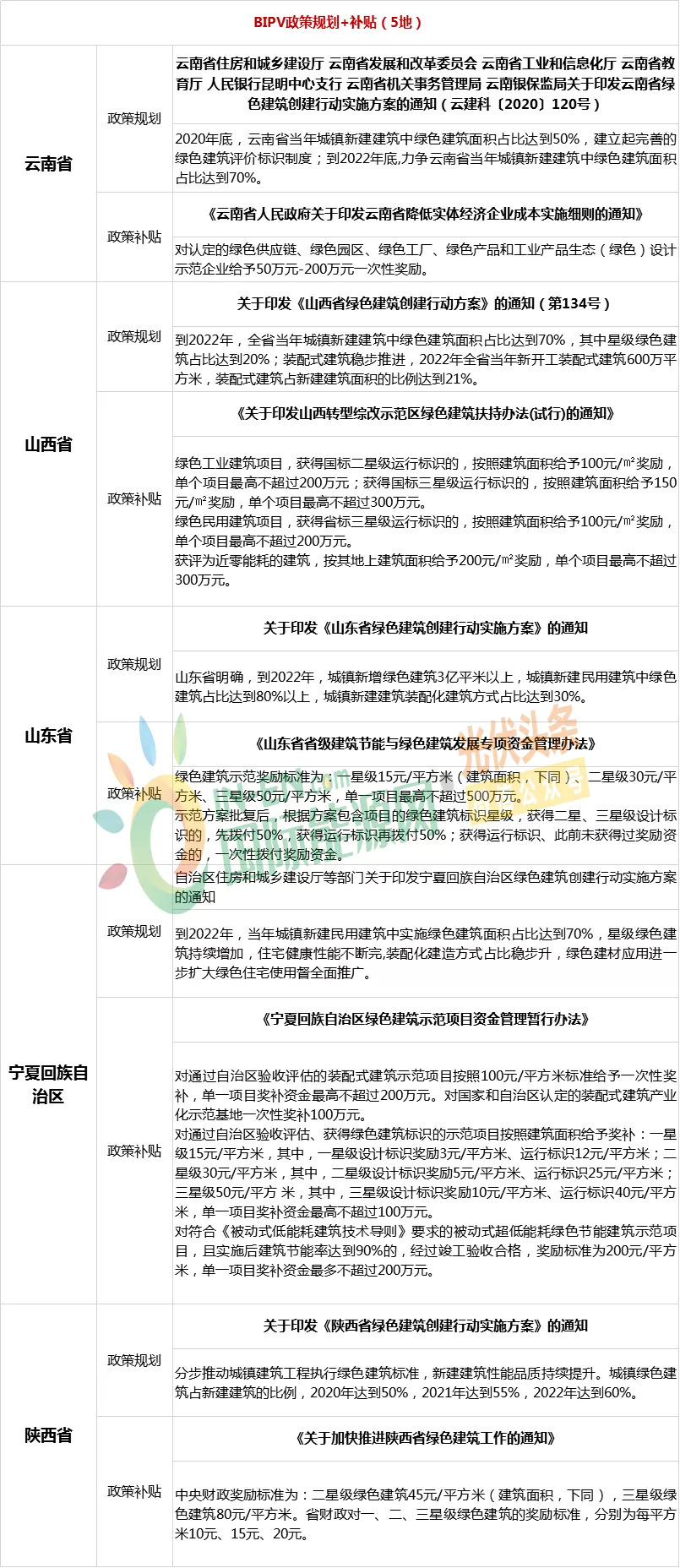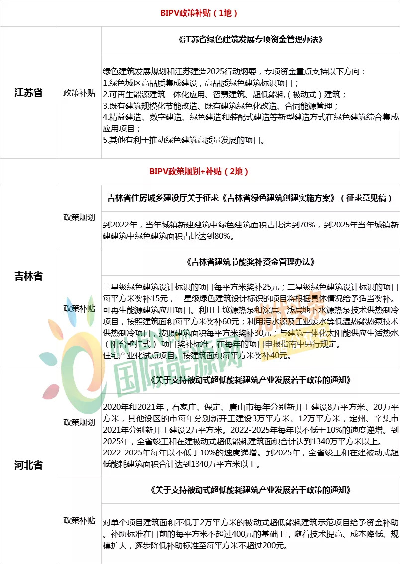 其中,北京、上海、重庆、浙江、新疆乌鲁木齐、云南、山西、山东、宁夏、陕西、吉林、河北、江苏13地明确建设BIPV绿色建筑有补贴;