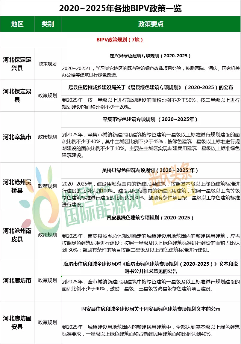 吉林、河北、河北保定定兴县、河北保定易县、河北辛集市、河北沧州吴桥县、河北沧州南皮县、河北廊坊市、河北廊坊固安县9地发布BIPV五年规划(2020~2025年)。