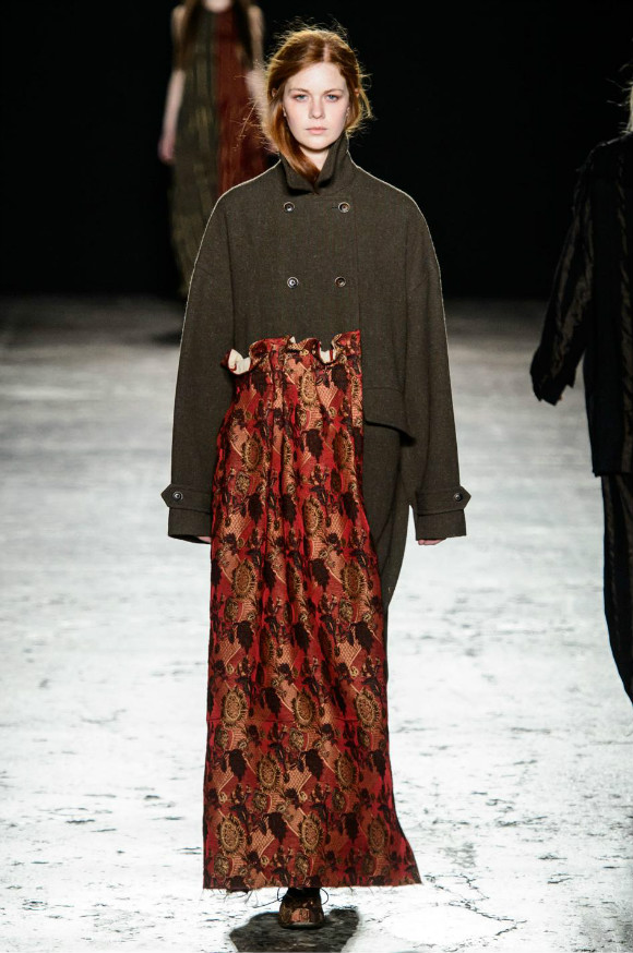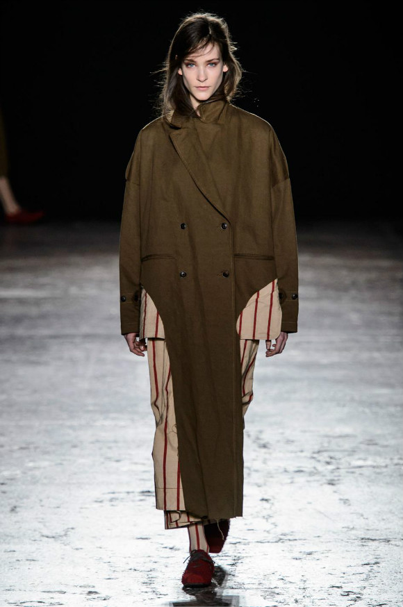 就在几天前,王汁照旧把新一季时装周办在了米兰。模特在带有不祥预感的开场音乐下急速步入,她们身上的帝国军装与华丽锦缎冲撞出一股决绝的浪漫主义气息。设计师将黯哑与光泽的面料融合进她不规则的形状条块中,细条纹上的中国情调无疑是个撩拨人心的细节。