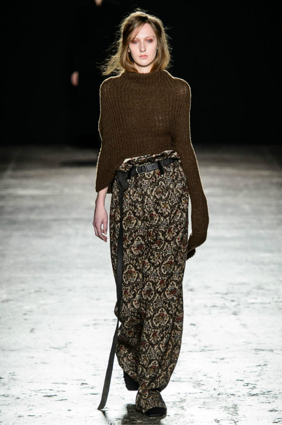 在本季伦敦时装周上呼声颇高的李筱与张卉山被安排在关键的时间位——紧随本地品牌 Jonathan Sauders、Richard Nicoll 和 Meadham Kirchhoff 后发布。曾在 Dior 高定工坊磨练过的张卉山已摆脱早期对于中国风格的运用,呈现出更普适的女装观念。就拿这次秋冬系列为例,他将印花丝绸以集合拼贴的形式呈现出来,灵感来自中国瓷器。从波尔道夫到布朗斯百货,他的时装如今可以很骄傲地和 Giambattista Valli、Emlia Wickstead、Erdem 等品牌并立。