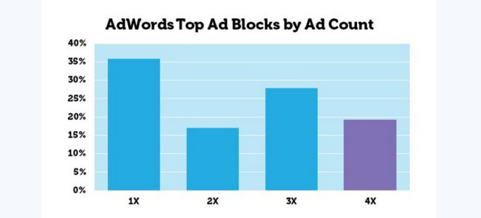 根据国外MozCast数据分析统计,目前谷歌搜索结果页面出现4条广告的占比已经接近20%,已经超过出现2条广告17%的比例。