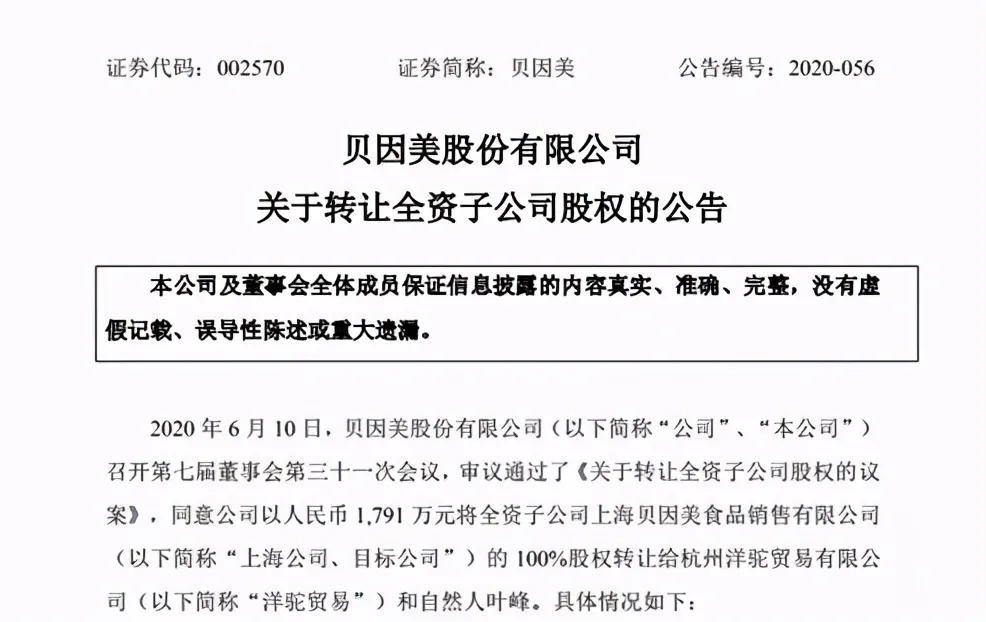 6月,贝因美拟以1791万元将全资子公司上海贝因美食品销售有限公司的100%股权,以及“童享”品牌及其相关产品运营权,转让给杭州洋驼贸易有限公司和自然人叶峰。
