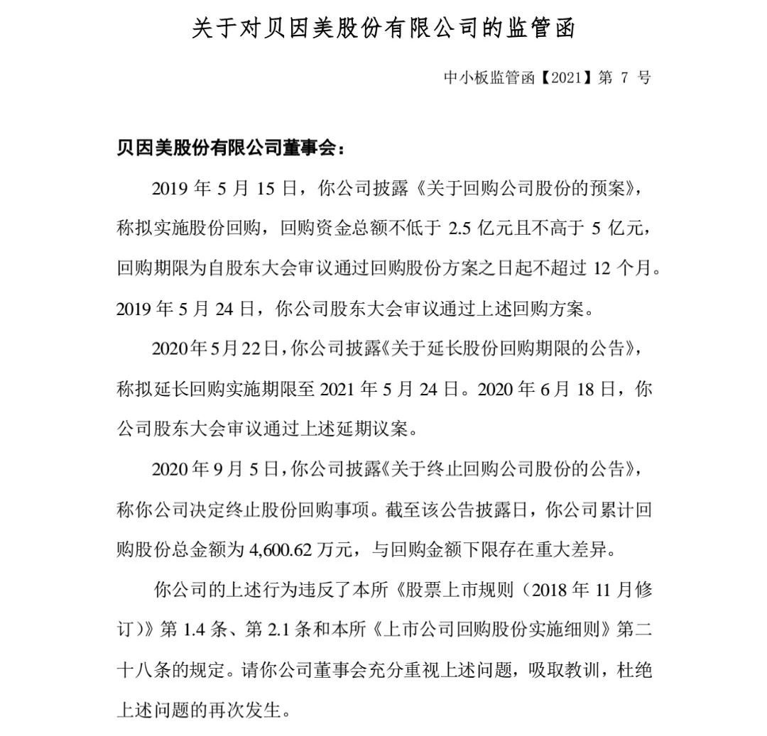 另外,需要注意的是,在今年1月14日,贝因美还收到监管函,被警告违反了《股票上市规则(2018年11月修订)》第1.4条、《上市公司回购股份实施规则》第二十八条的规定,责令贝因美董事会应充分重视上述问题,吸取教训,杜绝上述问题的再次发生。