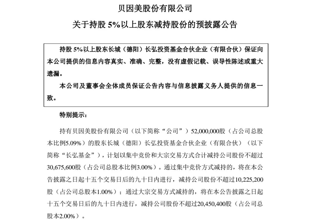 就在1月13日,贝因美发布公告称,持股5.09%的长弘基金以集中竞价和大宗交易方式合计减持公司股份不超过3067.56万股(占公司总股本比例3%)。资料显示:未减持前,长弘基金为贝因美集团第三大股东。