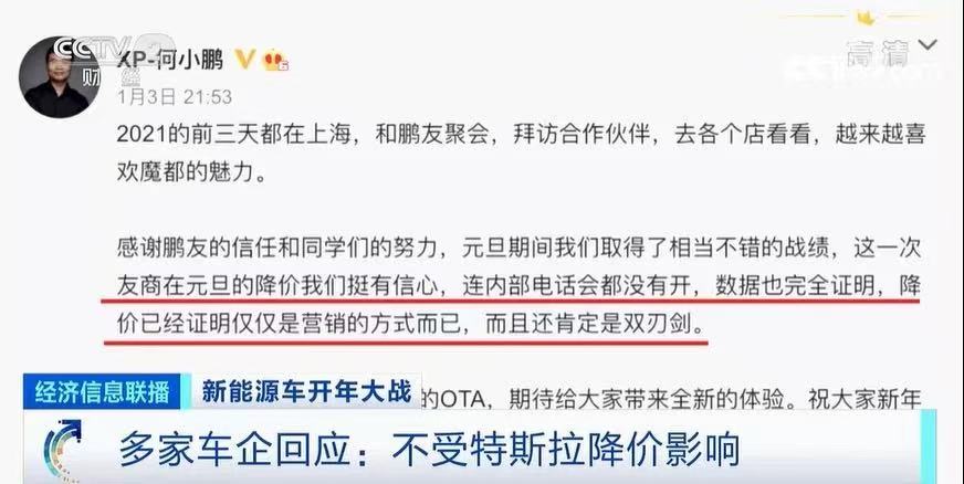 就在当天,小鹏汽车创始人何小鹏也在社交平台发声:特斯拉的降价对自己并没有影响,这仅仅是一种营销方式,而且肯定是把双刃剑。