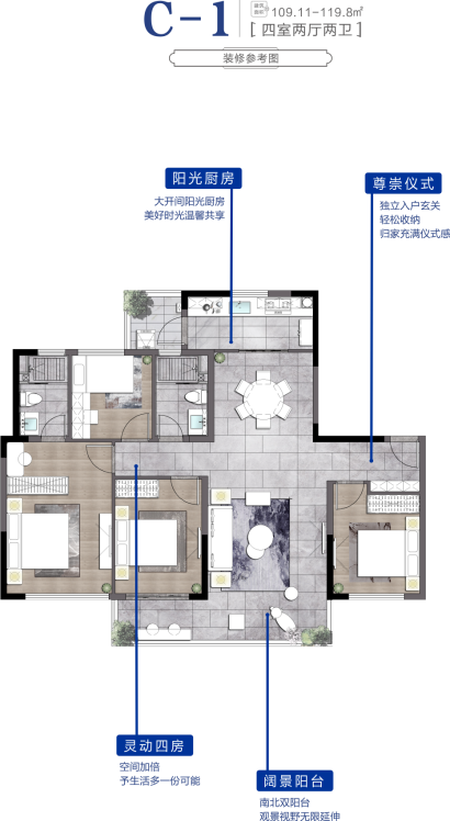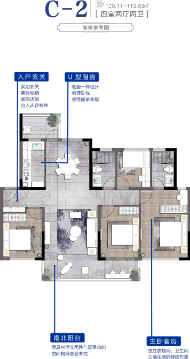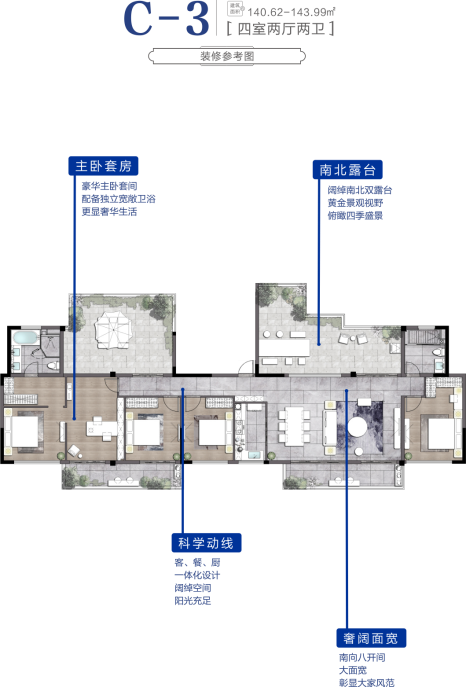 打造南向四开间格局,270度采光,大限度迎入阳光