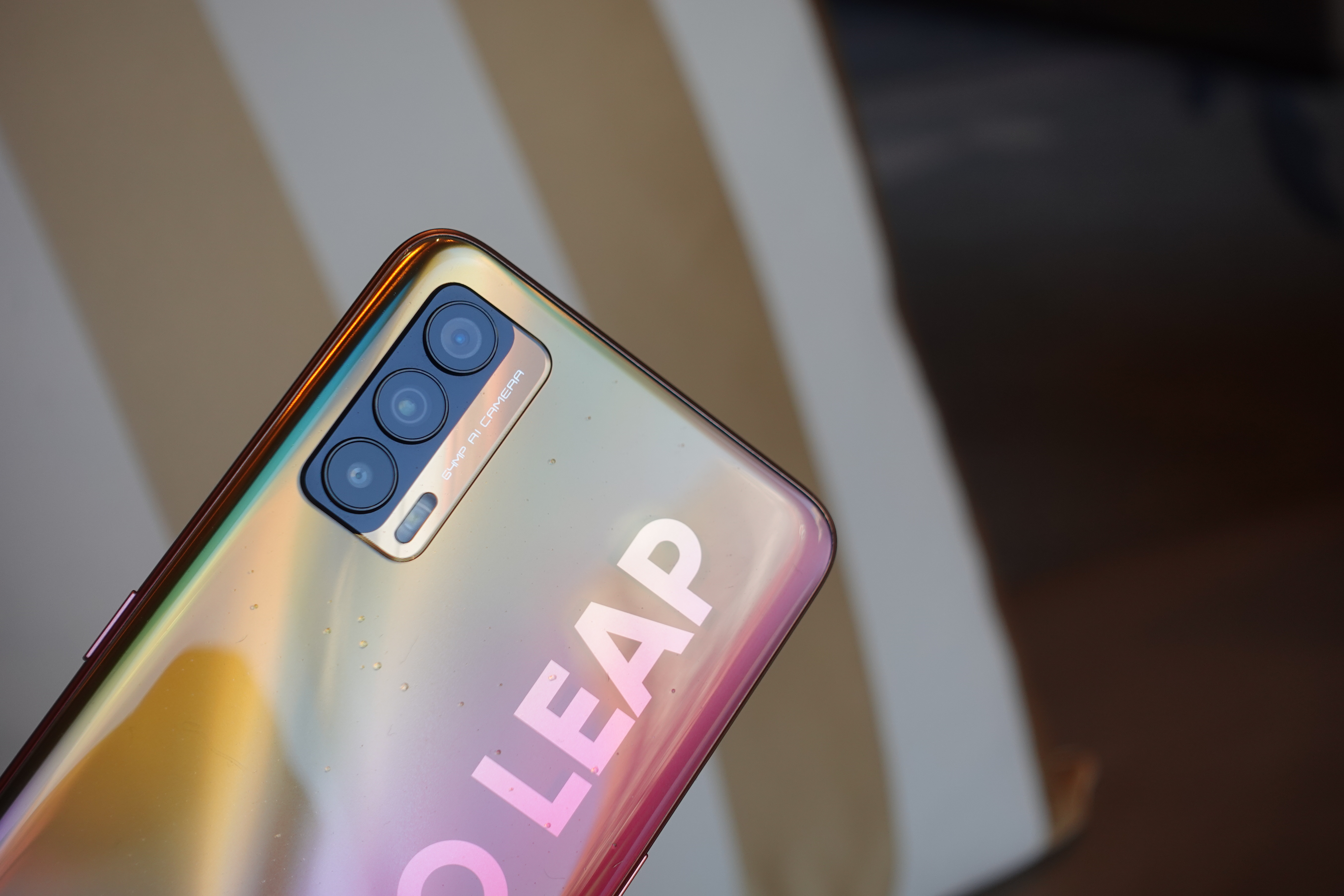 realme V15主打“国潮锦鲤手机”的卖点,在配色方面加入了“锦鲤色”,带来了一种多饱和色彩融合渐变的视觉效果,在不同的光照角度下,色彩较为绚丽。