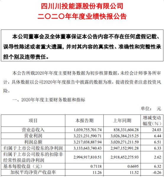 1月12日,川投能源发布2020年度业绩快报,根据快报内容显示:预计2020年公司实现营业收入10.4亿元,同比增长24.03%;净利润31.34亿元,同比增长6.33%。作为电力行业上市公司中,最早发布财务快报的上市公司,川投能源的业绩增长究竟源于何处?