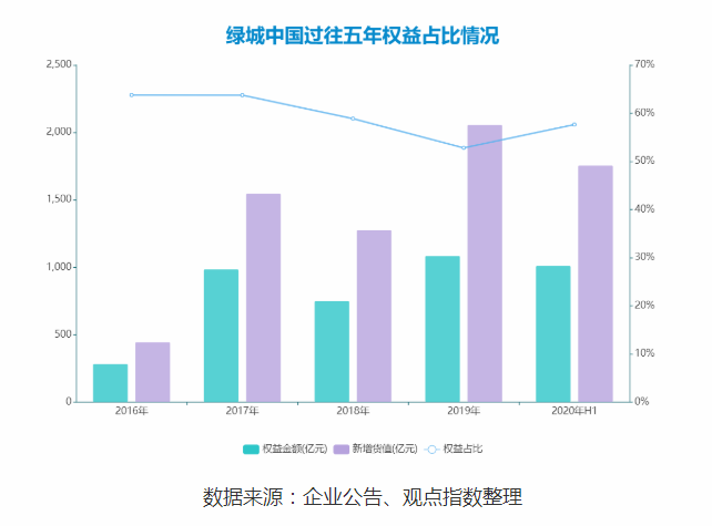 2019年,绿城新增货值权益占比为52.8%,这也是其规模突破千亿以后的最低值。