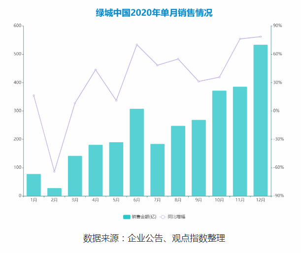 能够看到的是,绿城2020年有超过一半月份销售同比增幅高于30%。距离较近的11月,单月销售为386亿元,同比增长76.26%。