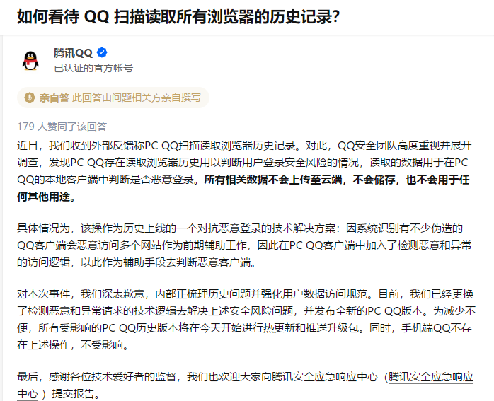 近期,有网友在知乎提问“如何看待QQ扫描读取所有浏览器的历史记录?”对此,腾讯QQ回应称,针对外部反馈PC QQ扫描读取浏览器历史记录一事,QQ安全团队高度重视并展开调查,发现PC QQ存在读取浏览器历史用以判断用户登录安全风险的情况,读取的数据用于在PC QQ的本地客户端中判断是否恶意登录。所有相关数据不会上传至云端,不会储存,也不会用于任何其他用途。