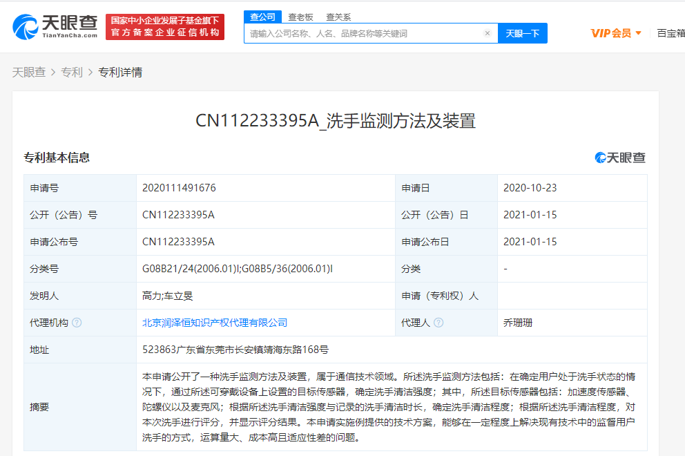 据天眼查APP显示,1月15日,vivo关联公司维沃移动通信有限公司公开了多项专利,其中一项专利名称为“洗手监测方法及装置”,申请日为2020年10月23日。
