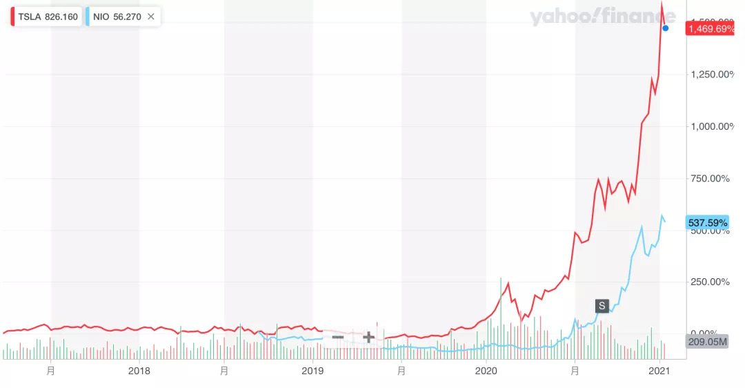 特斯拉和蔚来的股价涨幅对比,图源:雅虎财经