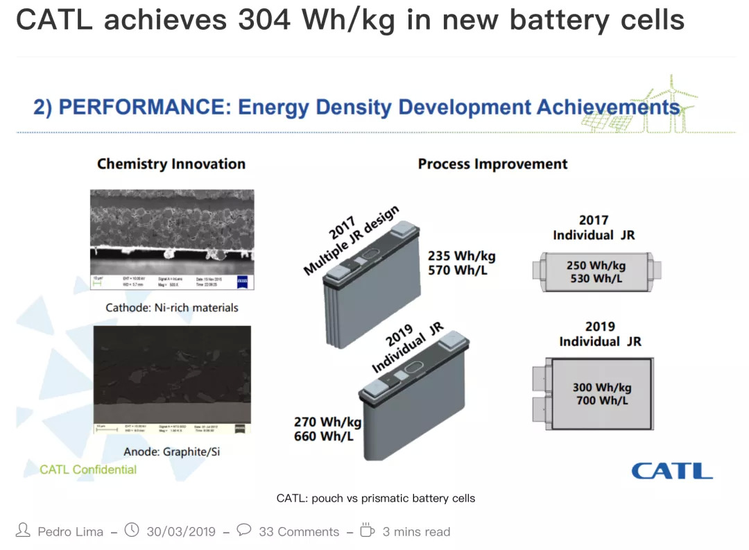 2019年宁德时代开发出比能量304Wh/kg电池样品,图源:PushEV