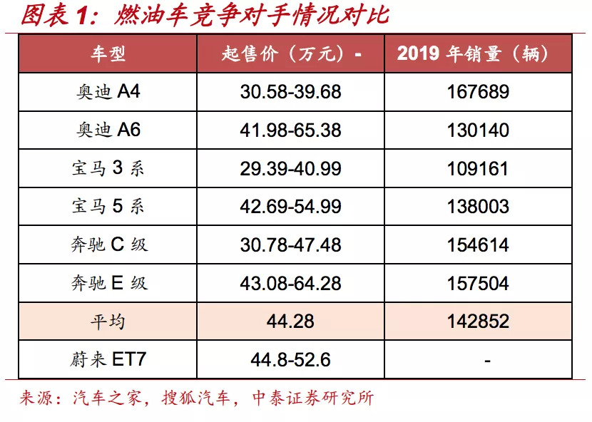 蔚来ET7与BBA燃油车对比,图源:中泰证券