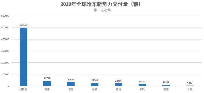 数据显示,2020年全年,蔚来、理想、小鹏分别交付43728辆、32624辆、27041辆,蔚来汽车的销量同比增长112.6%。