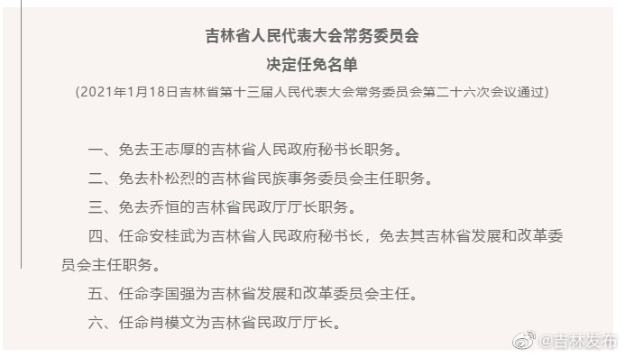 据@吉林发布 消息,2021年1月18日吉林省第十三届人民代表大会常务委员会第二十六次会议通过:一、免去王志厚的吉林省人民政府秘书长职务。二、免去朴松烈的吉林省民族事务委员会主任职务。三、免去乔恒的吉林省民政厅厅长职务。四、任命安桂武为吉林省人民政府秘书长,免去其吉林省发展和改革委员会主任职务。五、任命李国强为吉林省发展和改革委员会主任。六、任命肖模文为吉林省民政厅厅长。